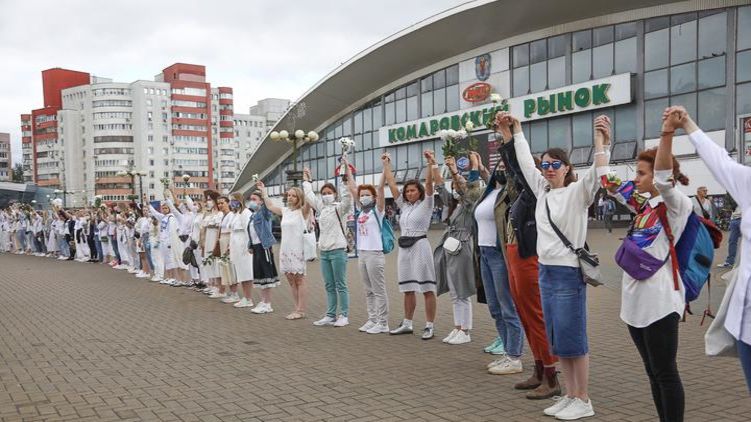 У Комаровского рынка в Минске около двух сотен девушек выстроились в живую цепь с цветами в руках в знак мирного протеста против насилия в Белоруссии, которое продолжается после выборов президента.