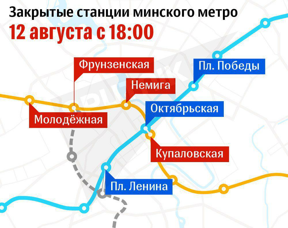 18:17 Минск. Перекрыты несколько станций метро: "Купаловская", "Немига", "Фрунзенская", "Молодежная", "Площадь Ленина", "Площадь Победы". Поезда следуют без остановки на этих станциях.