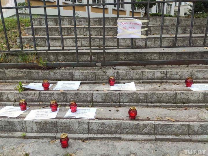 19:17 Минск. К гимназии № 192, где размещался избирательный участок, принесли лампады и листы с надписями: "Здесь похоронен мой голос"