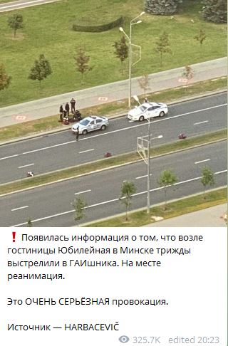 20:30 Телеграм-канал Nexta live пишет, что появилась информация о том, что возле гостиницы "Юбилейная" в Минске трижды выстрелили в ГАИшника. На месте реанимация.