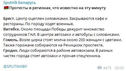 20:47 "Спутник Беларусь" сообщает, что происходит в регионах.