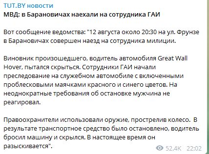 22:02 Официальные подробности о происшествии с работником ГАИ в Минске, о котором телеграм-каналы сообщили, что в него стреляли.
