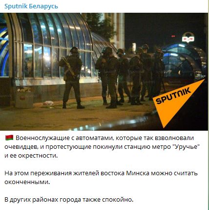 23:46 Минск. "Военнослужащие с автоматами, которые так взволновали очевидцев, и протестующие покинули станцию метро "Уручье" и ее окрестности. На этом переживания жителей востока Минска можно считать оконченными. В других районах города также спокойно" - пишет "Спутник Беларусь".