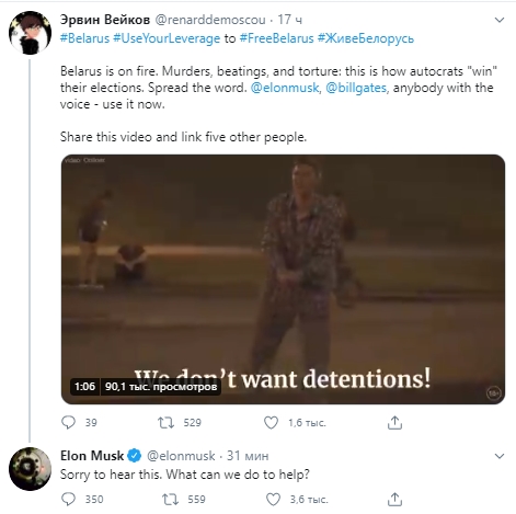 "Чем мы можем помочь?" Илон Маск отреагировал на ситуацию с протестами в Беларуси