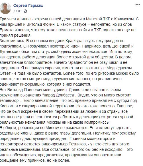"Три часа длилась встреча нашей делегации в Минской ТКГ с Кравчуком. С ним пришел и Витольд Фокин. В каком статусе – непонятно, но из слов Ермака я понял, что ему тоже предлагают войти в ТКГ, однако он еще не принял решения", – сообщил Гармаш.