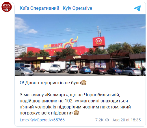 Сообщается, что из "Велмарта" на улице Чернобыльской в Киеве поступил вызов на линию 102 о том, что в магазине находится пьяный мужчина с подозрительным черным пакетом и "угрожает всех взорвать".