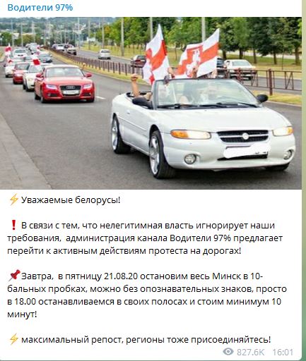 "Завтра, в пятницу 21.08.20 остановим весь Минск в 10-бальных пробках, можно без опознавательных знаков, просто в 18.00 останавливаемся в своих полосах и стоим минимум 10 минут!" - говорится в сообщении.