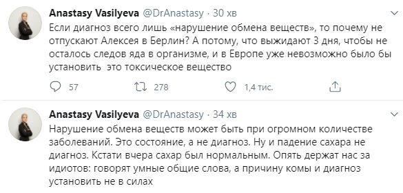 "Нарушение обмена веществ может быть при огромном количестве заболеваний. Это состояние, а не диагноз. Ну, и падение сахара не диагноз. Кстати, вчера сахар был нормальным... Если диагноз всего лишь "нарушение обмена веществ", то почему не отпускают Алексея в Берлин? А потому, что выжидают 3 дня, чтобы не осталось следов яда в организме, и в Европе уже невозможно было бы установить это токсическое вещество", - написала медик в Twitter.