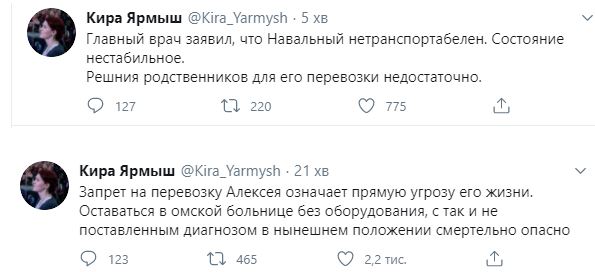 Пресс-секретарь Навального уже написала, что запрет на перевозку означает прямую угрозу его жизни. "Оставаться в омской больнице без оборудования, с так и не поставленным диагнозом в нынешнем положении смертельно опасно", - написала Ярмыш.