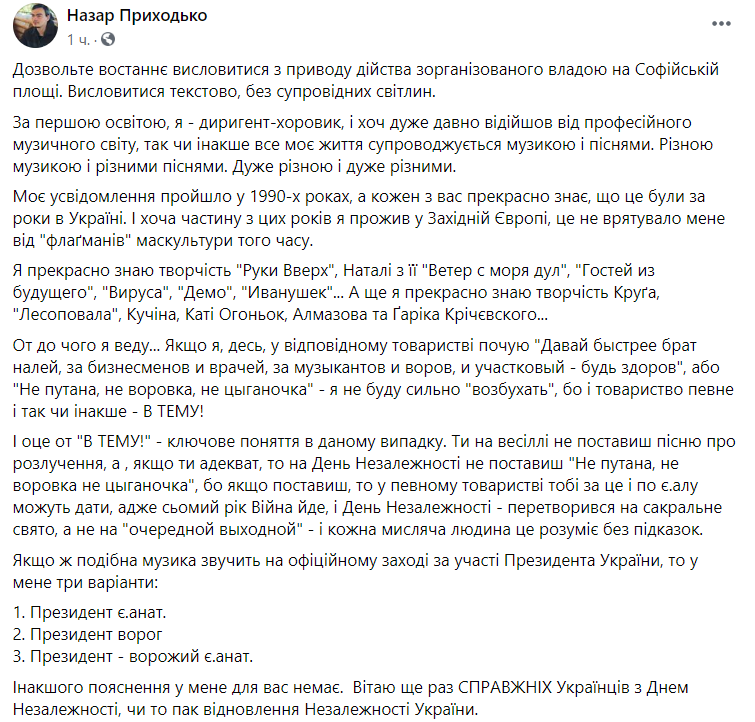 "Знаю, что многим не понравится мой комментарий, но я выступаю именно за такой современный формат празднования Дня независимости. Большой музыкальный номер из попурри украинских песен попал в самое сердце, ведь он показывает ценности, которые объединяют страну. Он играет на эмоциях миллионов к своей Родине и очень далек от традиционной политики с пафосными речами на трибуне и ненасытным грабежом за кулисами.