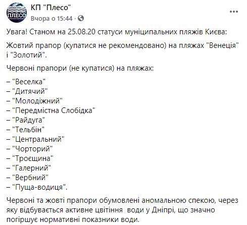 По состоянию на 25 августа статусы муниципальных пляжей Киева красные флаги (не купаться) установлены на пляжах: