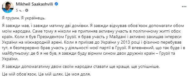 По-украински Михо написал, что у него всегда будет два дома - Грузия и Украина. И он будет "помогать обоим народам". То есть достаточно неконкретное заявление с легким намеком на поворот к грузинской проблематике.