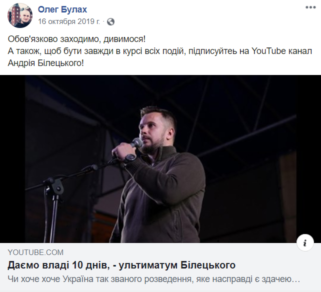 "Обязательно заходим, смотрим! А также, чтобы быть в курсе всех событий, подписывайтесь на YouTube канал Андрея Билецкого!", - писал он в октябре 2019 года, когда Билецкий выступил с ультиматумом Владимиру Зеленскому.