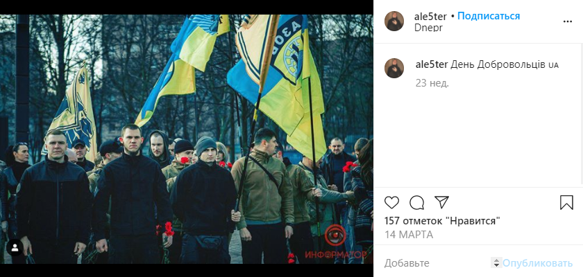 Он публикует фото с закрытым лицом, а на его странице есть реклама YouTube-канала лидера "Нацкорпуса" Билецкого.