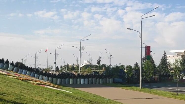 В Минске сотрудники спецслужб перекрыли подходы к резиденции президента Беларуси – Дворцу Независимости. Колонна протестующих сейчас движется от стелы "Минск – город герой" по направлению к дворцу.