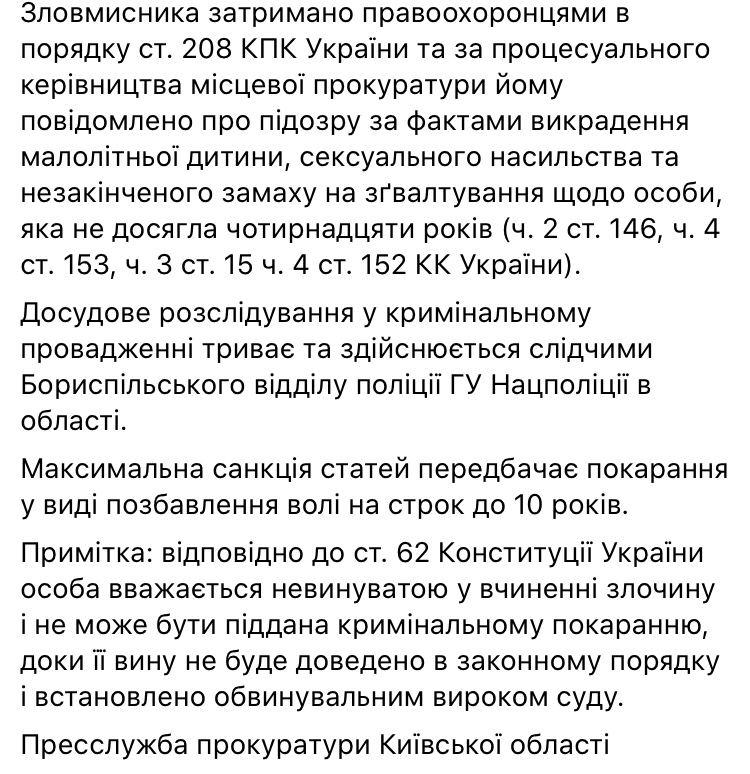 Суд арестовал мужчину, который хотел изнасиловать 4-летнюю девочку в Борисполе. Скриншот: Facebook/ Прокуратура Киевской области