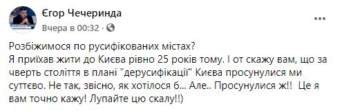 "Попытка создать свой мэм похвальна. Вот только не было никогда никаких "русифікованих міст". Русификация предусматривает, что кто-то пришел и кого-то русифицировал, навязал русский язык. Однако все крупные украинские города изначально были русскоязычными. Более того, переписи начала ХХ века показывают, что украинцы в них составляли меньшинство. Частично украинизировали города как раз большевистская украинизация и Вторая мировая война", - написал он.