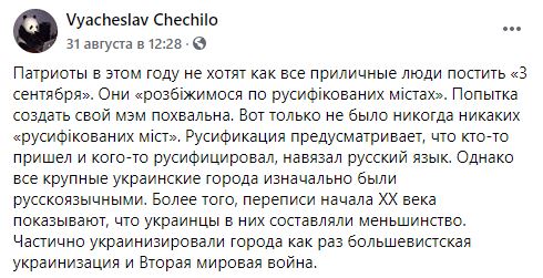 Журналист Вячеслав Чечило обратил внимание, что "патриоты в этом году не хотят, как все приличные люди, постить "Третье сентября", а пишут "розбіжимося по русифікованих містах", и назвал это попыткой создать свой мем.