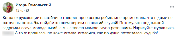 "Когда окружающие настойчиво говорят про костры рябин, мне прямо жаль, что в доме не наточены ножи. Эх, пойдём ко всем чертям на всякий случай! Потому, что под ольхой задремал есаул молоденький, а мы с твоею мамою глупо разошлись. Нарисуйте журавлика! А то ж прошлась по коже иголка-иголочка, как по душе потопталась судьба!", - пишет пользователь Игорь Гомольский.