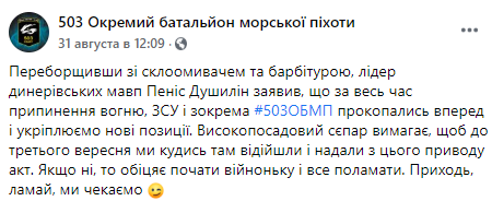 Украинская власть в ответ на эти заявления хранила гробовое молчание. При этом ответил 503-й батальон морской пехоты, который удерживает означенные позиции. Он в довольно развязном тоне заявил, что никто никуда не уйдет, а Пушилин, если хочет, может прийти и попробовать атаковать.