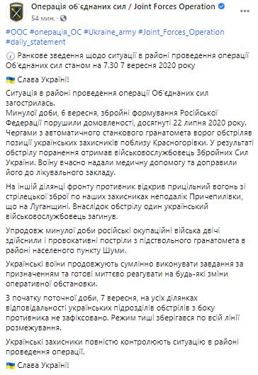"Ситуация в районе проведения операции Объединенных сил обострилась. За прошедшие сутки, 6 сентября, вооруженные формирование Российской Федерации нарушили договоренности, достигнутые 22 июля 2020. Очередью из автоматического станкового гранатомета враг обстрелял позиции украинских защитников около Красногоровка. В результате обстрела ранения получил военнослужащий ВСУ. Ему вовремя оказали медпомощь и доставили в лечебное учреждение" - говорится в сводке.