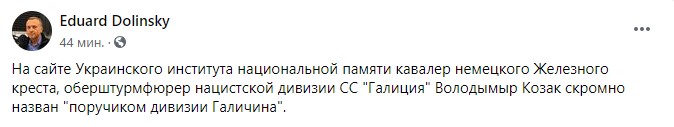 "На сайте Украинского института национальной памяти кавалер немецкого Железного креста, оберштурмфюрер нацистской дивизии СС "Галиция" Володымыр Козак скромно назван "поручиком дивизии Галичина", - написал он.