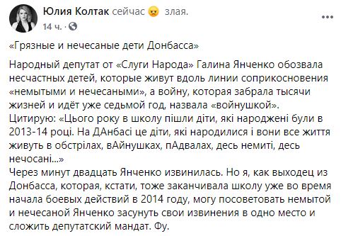 "Через минут двадцать Янченко извинилась. Но я, как выходец из Донбасса, которая, кстати, тоже заканчивала школу уже во время начала боевых действий в 2014 году, могу посоветовать немытой и нечесаной Янченко засунуть свои извинения в одно место и сложить депутатский мандат. Фу", - написала Колтак.