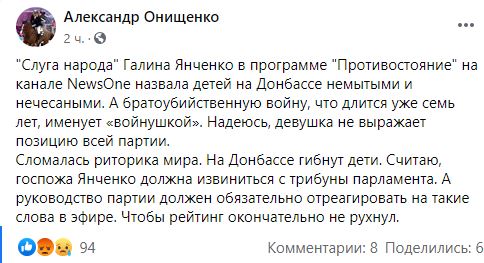 Сломалась риторика мира. На Донбассе гибнут дети. Считаю, госпожа Янченко должна извиниться с трибуны парламента. А руководство партии должен обязательно отреагировать на такие слова в эфире. Чтобы рейтинг окончательно не рухнул", - написал Онищенко.