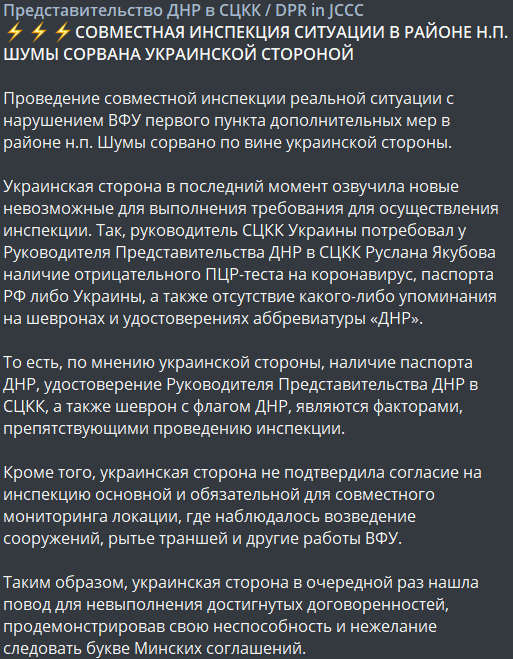 "Украинская сторона в последний момент озвучила новые невозможные для выполнения требования для осуществления инспекции. Так, руководитель СЦКК Украины потребовал у Руководителя Представительства ДНР в СЦКК Руслана Якубова наличие отрицательного ПЦР-теста на коронавирус, паспорта РФ либо Украины, а также отсутствие какого-либо упоминания на шевронах и удостоверениях аббревиатуры "ДНР"...