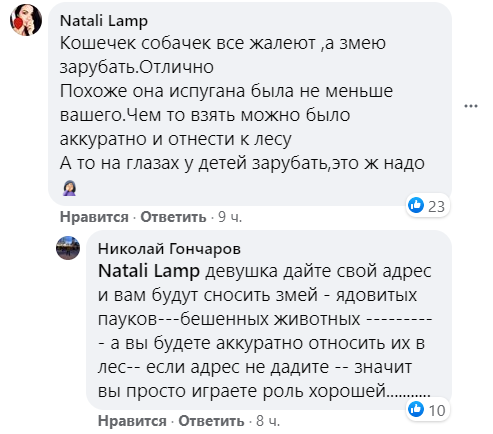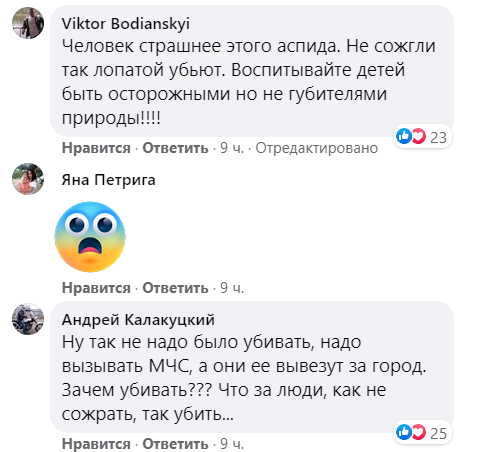 "Не обязательно было рубить, это тоже животное и безвредно, обыкновенный уж, можно было в посадку отнести", "Не надо было убивать, надо вызвать ГСЧС, а они ее вывезут за город. Зачем убивать? Что за люди, не сожрать, так убить", "Кошечек собачек все жалеют, а змею зарубить, замечательно. Похоже она напугана была не меньше вас. А то на глазах у детей зарубил, это же надо", "Человек страшнее этого аспида. Как не сожгут, так лопатой убьют. Воспитывайте детей быть осторожными, но не губителями природы!", - пишут зоозащитники.