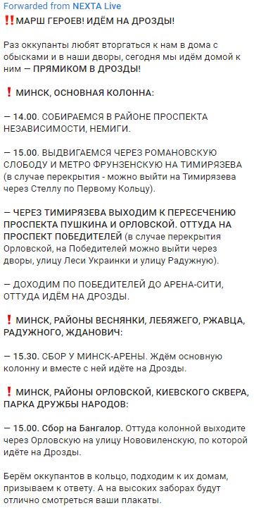 13:58  Сегодня оппозицию призывают идти к дому Лукашенко в Дроздах - это микрорайон Минска. Там живут и другие топ-чиновники.