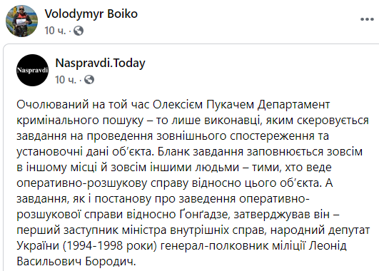 "Возглавляемый в то время Алексеем Пукачем Департамент уголовного розыска – это лишь исполнители, которым направляется задание на проведение внешнего наблюдения и установочные данные объекта. Бланк задачи заполняется совсем в другом месте и совсем другими людьми – теми, кто ведет оперативно-розыскное дело в отношении этого объекта. А задачи, как и постановление о заведении оперативно-розыскного дела относительно Гонгадзе, утверждал он – первый заместитель министра внутренних дел, народный депутат Украины (1994-1998 годы) генерал-полковник милиции Леонид Васильевич Бородич", – пишет Бойко.