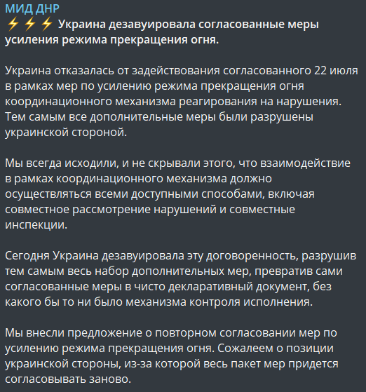 "Украина отказалась от задействования согласованного 22 июля в рамках мер по усилению режима прекращения огня координационного механизма реагирования на нарушения. Тем самым все дополнительные меры были разрушены украинской стороной", - заявили в "МИД республики".