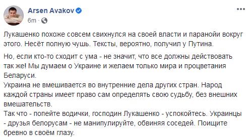 Так что - попейте водички, господин Лукашенко - успокойтесь. Украинцы - друзья белорусам - не манипулируйте, обвиняя соседей. Поищите бревно в своём глазу.", - написал глава МВД.