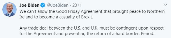 В частности, Байден выступил против законопроекта, внесенного британским правительством в парламент, который может повысить риски возникновения жесткой границы между Северной Ирландией и Ирландией. "Соблюдение (Белфастского) соглашения и избежание жесткой границы — условие для любых договоренностей о торговле между США и Соединенным Королевством", — написал Байден в Twitter.