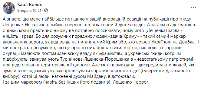 А блогер Карл Волох порадовался, что никто из критиков Лещенко не спорит с его тезисами по существу, а сразу называет их "зрадой".