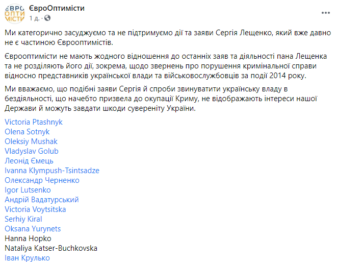 Еврооптимисты не имеют никакого отношения к последним заявлениям и деятельности господина Лещенко и не разделяют его действия, в частности, по обращениям о возбуждении уголовного дела в отношении представителей украинской власти и военнослужащих за события 2014 года.