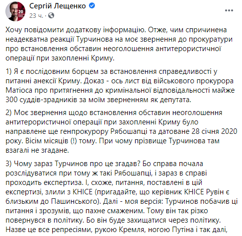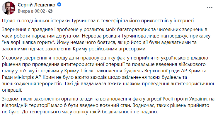 Лещенко еще в январе требовал проверить, почему власти Украины зимой-весной 2014 года не ввели в Крыму ни антитеррористической операции, ни военного положения. И не является ли это с их стороны преступлением.