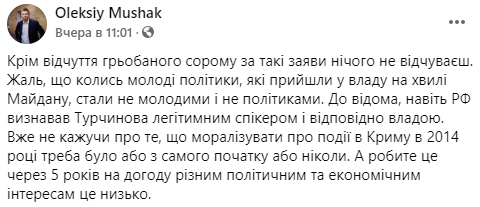 "Кроме ощущения гребаного стыда за такие заявления ничего не чувствуешь. Жаль, что когда молодые политики, которые пришли во власть на волне Майдана, стали не молодыми и не политиками. К сведению, даже РФ признавала Турчинова легитимным спикером и соответственно властью. Уже не говоря о том, что морализировать о событиях в Крыму в 2014 году надо было или с самого начала или никогда. А делать это через 5 лет в угоду различным политическим и экономическим интересам это низко", - отдельно прокомментировал бывший советник премьера Гончарука и нардеп от БПП Алексей Мушак.