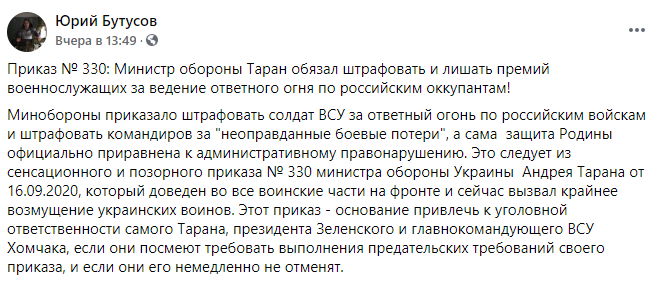 Опубликовавший приказ Юрий Бутусов подает случившееся так: "Министр обороны Таран обязал штрафовать и лишать премий военнослужащих за ведение ответного огня по российским оккупантам!"