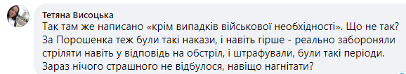 "Так там же написано "кроме случаев военной необходимости". Что не так? При Порошенко тоже были такие приказы, и даже хуже - реально запрещали стрелять даже в ответ на обстрел, и штрафовали, были такие периоды. Сейчас ничего страшного не произошло, зачем нагнетать?", - удивляется журналистка Татьяна Высоцкая.