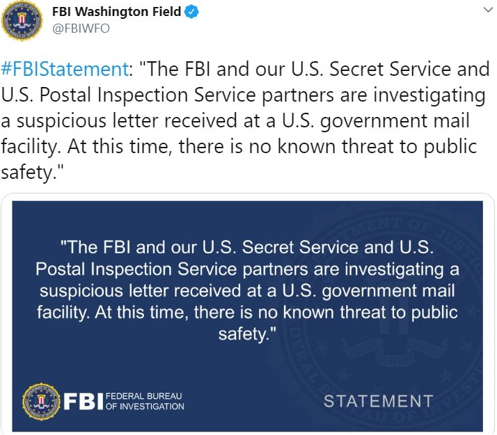 "ФБР со своими партнерами из Секретной службы США и инспекции Почтовой службы изучают подозрительное письмо, полученное на почтовом объекте правительства США. В настоящее время нет сведений о наличии угрозы общественной безопасности", - указано в сообщении ФБР в Twitter.