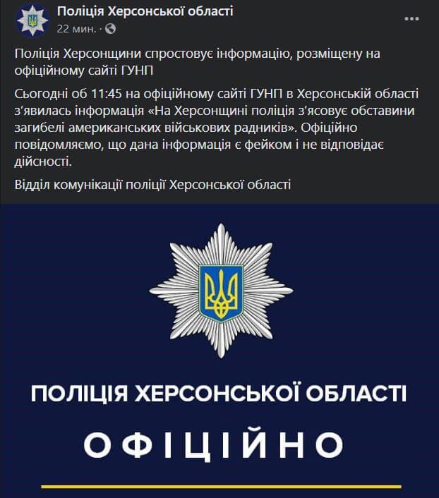Сегодня на cайте Херсонского облаcтного управления Нацполиции появилаcь скандальная информация. Полицейские сообщили, что на военном полигоне Олешковcкого района погибли американские военные советники.