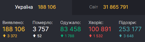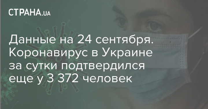 В Украине по состоянию на утро четверга, 24 сентября, зафиксировано 3 372 новых случая заражения Covid-19. Таким образом, общее число зараженных выросло в стране до отметки в 188 106 человек.