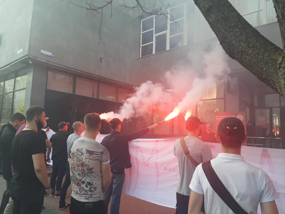 Также Долинский опубликовал фото националистов, которые сопровождали заседание суда митингом. На нем зажгли файеры.