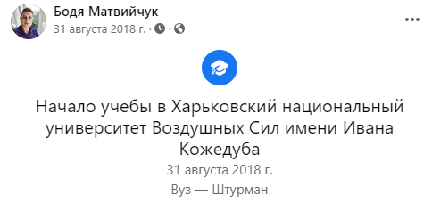 Максим Хомячук значится как выпускник харьковского авиавуза. В комментариях друзья называют его пилотом и желают легкой службы.