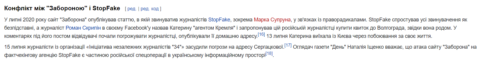 Причем они открыто поддержали "побратимов" из StopFake, когда атаковали в одной из статей энциклопедии журналистку сайта "Заборона" Екатерину Сергацкову – она критиковала Супруна и фактчекеров из "Фейсбука" за их близость к ультраправым. И вынуждена была из-за угроз радикалов покинуть Киев