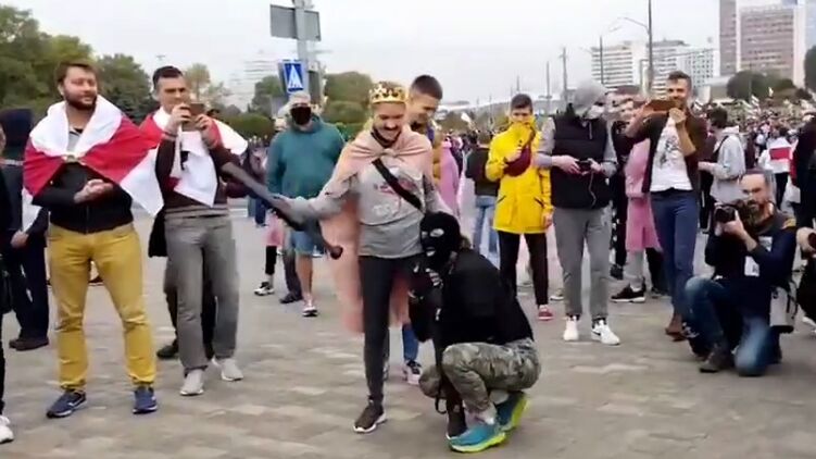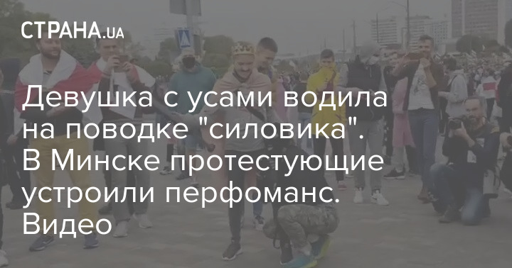 Девушка с усами водила на поводке "силовика". В Минске протестующие устроили перфоманс. Видео