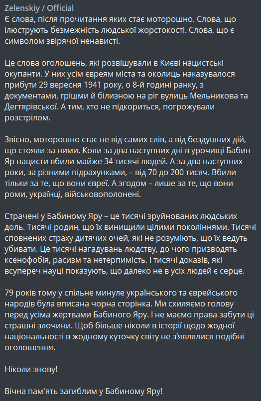 "Сегодня Украина чтит память жертв трагедии Бабьего Яра. Масштабы этого бедствия стали болью не только для Украины, но и для всего мира. Только потому, что кто-то считал себя вправе отнимать жизнь, погибли десятки, сотни тысяч людей. Сколько бы лет ни прошло, мы всегда должны помнить эти страшные страницы истории и делать все от нас зависящее, чтобы такого больше никогда не повторилось ни на территории Украины, ни в любой другой стране мира.