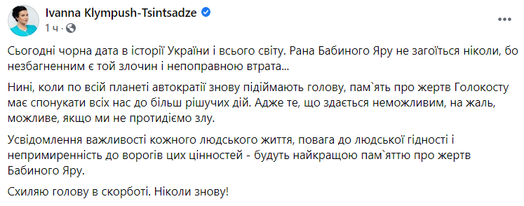 У его коллеги по партии Иванны Климпуш-Цинцадзе те же нарративы - с намеками на борьбу с Россией. При этом о немцах, которые убили десятки тысяч людей в Бабьем Яре, у депутатки ни слова.